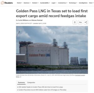 But this week, the Golden Pass LNG facility on the Texas/Louisiana border produced its first LNG volumes, which will be loaded on a vessel in late April.