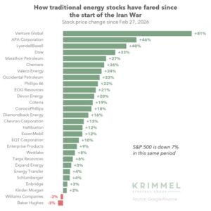 The S&P 500 is down 7% since the start of the Iran War. But 26 of 28 large traditional energy stocks I follow are up over the past month.